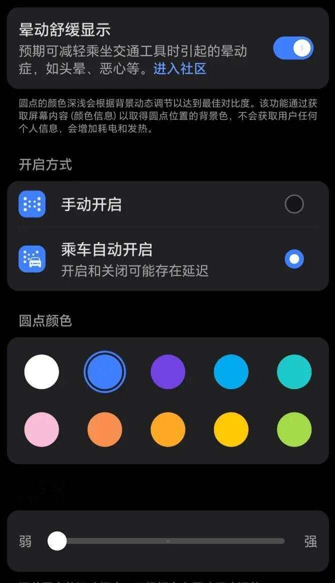 开启/关闭方式:1、进入设置辅助功能晕动舒缓显示,开启晕动舒缓显示开关,开启后屏幕两侧将出现动态圆点,呈现车辆运动状态。2、支持自定义颜色,根据自身喜好,选择圆点颜色。3、根据自身晕动反应程度,滑动灵敏度下的控制条,调节圆点的运动幅度,更好地舒缓头晕、恶心等晕车不适。