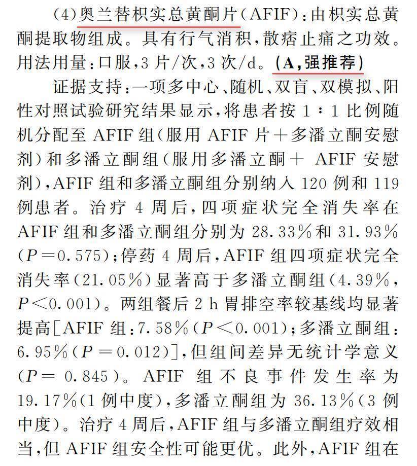 共识中支持枳实总黄酮片推荐的关键研究为一项多中心、随机、双盲、阳性药对照临床试验。研究结果显示,服药4周时,枳实总黄酮片组在改善“餐后饱腹感、早饱、上腹烧灼感、上腹疼痛”核心症状方面与多潘立酮疗效相当;而在停药4周后,枳实总黄酮片药在症状完全消失率及复发控制方面表现出更优的长期效果。枳实总黄酮片的双重作用机制——改善胃肠动力、降低内脏高敏感性,也契合FD多因素致病的病理特点,为临床/p>
